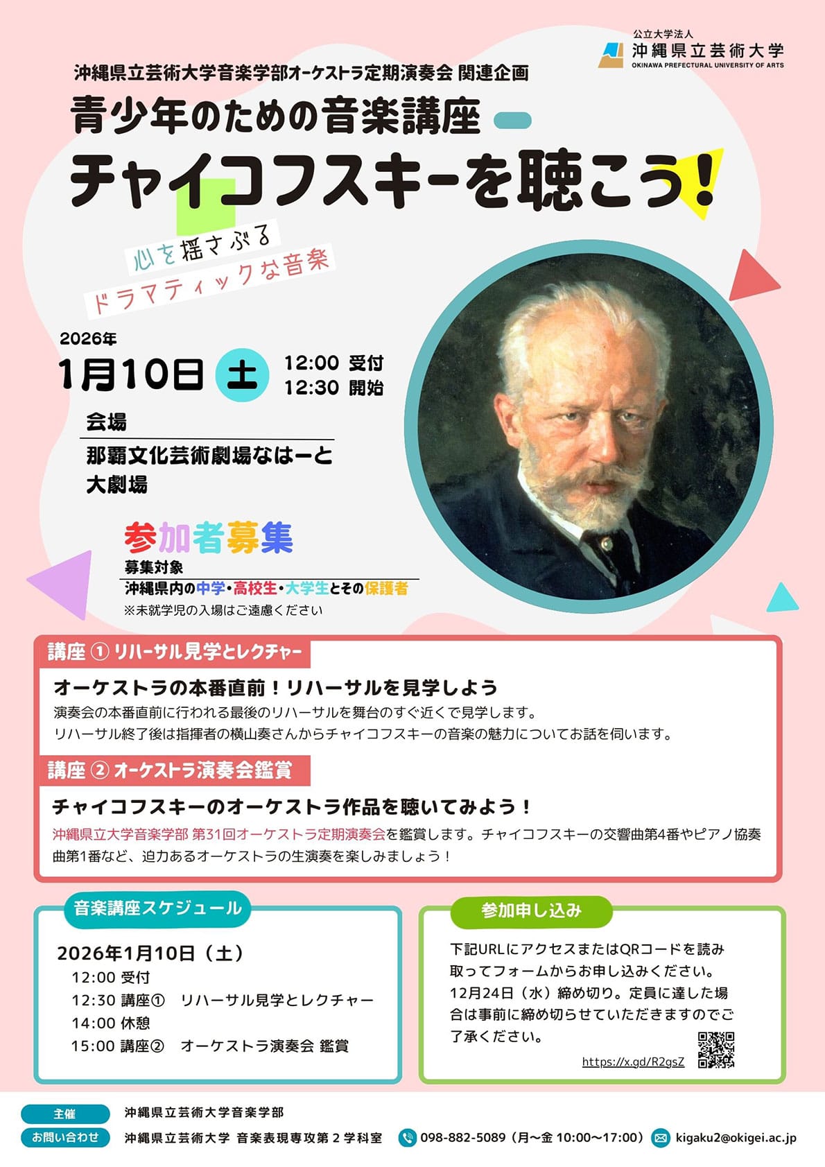 沖縄県立大学音楽学部 第31回オーケストラ定期演奏会を鑑賞します。 チャイコフスキーの交響曲第4番やピアノ協奏曲第1番など、迫力あるオーケストラの生演奏を楽しみましょう!
