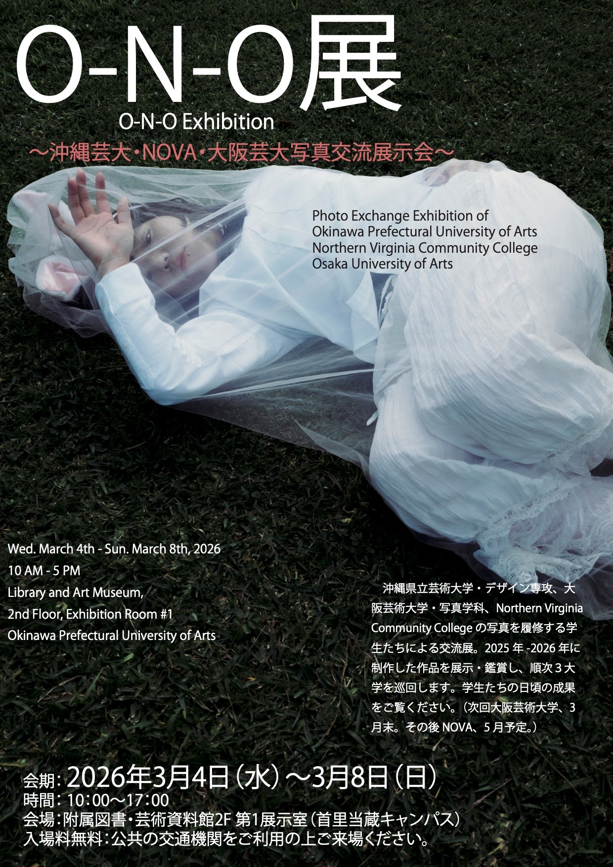 沖縄県立芸術大学・デザイン専攻、大阪芸術大学・写真学科、Northern Virginia Community Collegeの写真を履修する学生たちによる交流展。2025年-2026年に制作した作品を展示・鑑賞し、順次3大学を巡回します。学生たちの日頃の成果をご覧ください。(次回大阪芸術大学は3月末、その後NVCCは5月中旬を予定。)