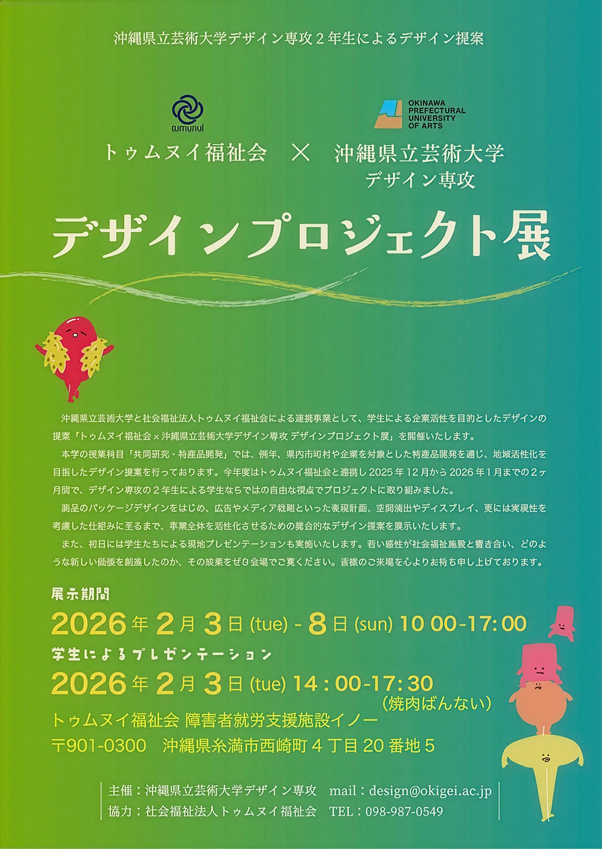 沖縄県立芸術大学と社会福祉法人トゥムヌイ福祉会による連携事業として、学生による企業活性を目的としたデザインの提案「トゥムヌイ福祉会 × 沖縄県立芸術大学デザイン専攻 デザインプロジェクト展」を開催いたします。 本学の授業科目「共同研究・特産品開発」では、例年、県内市町村や企業を対象とした特産品開発を通じ、地域活性化を目指したデザイン提案を行っております。今年度はトゥムヌイ福祉会と連携し2025年12月から2026年1月までの2ヶ月間で、デザイン専攻の2年生による学生ならではの自由な視点でプロジェクトに取り組みました。 商品のパッケージデザインをはじめ、広告やメディア戦略といった表現計画、空間演出やディスプレイ、更には実現性を考慮した仕組みに至るまで、事業全体を活性化させるための総合的なデザイン提案を展示いたします。 また、初日には学生たちによる現地プレゼンテーションも実施いたします。若い感性が社会福祉施設と響き合い、どのような新しい価値を創造したのか、その成果をぜひ会場でご覧ください。皆様のご来場を心よりお待ち申し上げております。