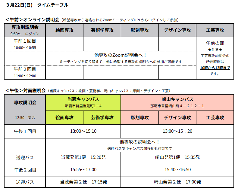 首里当蔵・首里崎山キャンパス内 各専攻教室・共通工房等(「実施要項」を参照のこと)