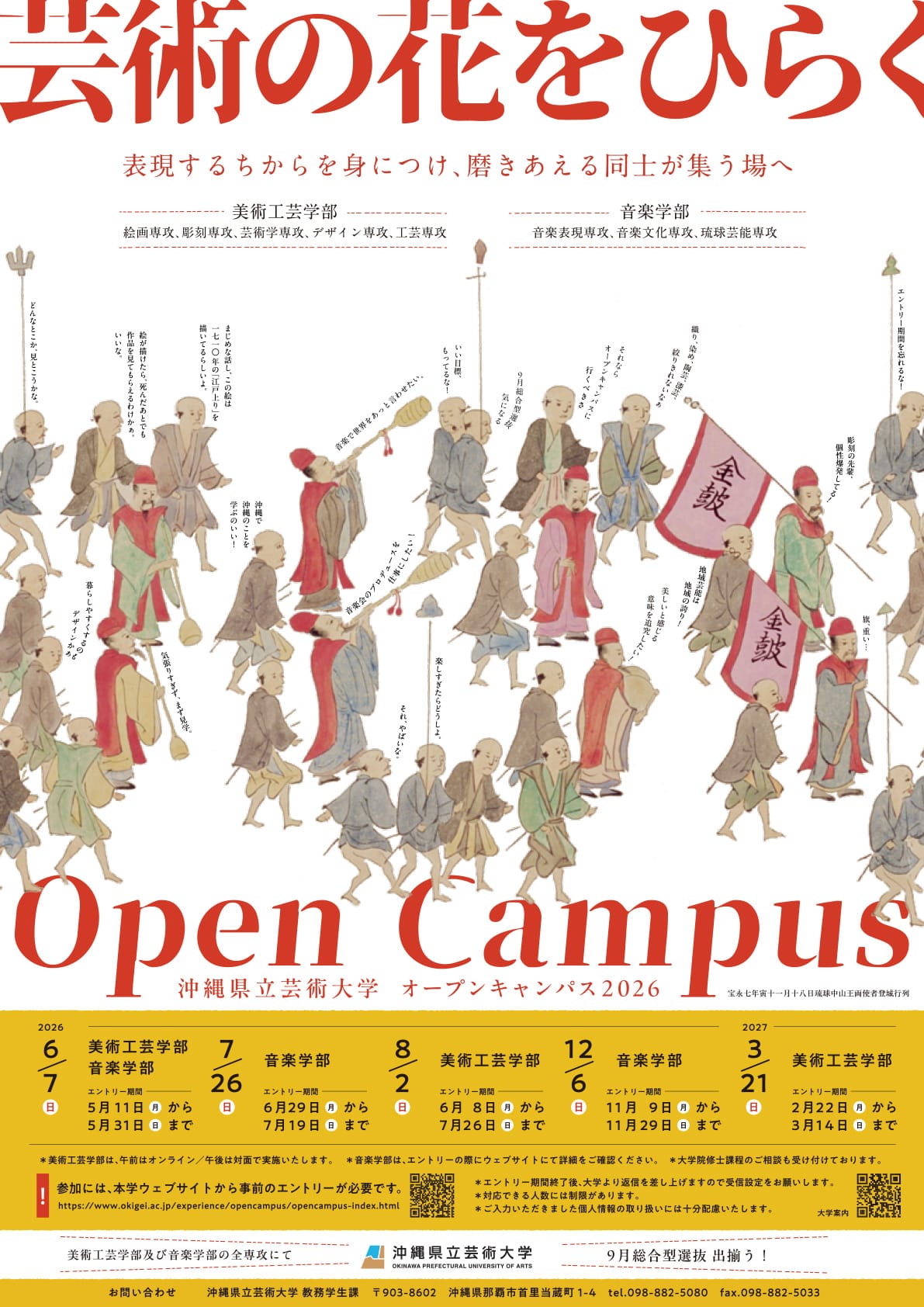 本学の美術工芸学部・音楽学部では、本学、または他の美術大学・音楽大学等へ進学を希望する人達を対象に、本学の校風・環境・教育の一端などを知っていただけるよう、オープンキャンパス及びサマースクールを開催しています。
