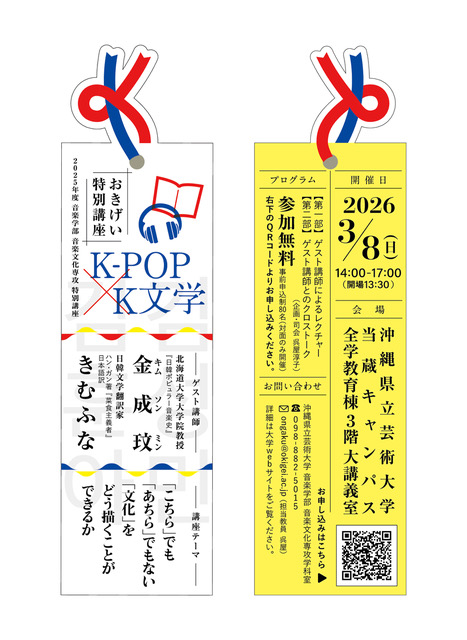 今回の特別講座では、こうした現代韓国のポピュラー音楽や文学の歴史的背景に詳しい2名の専門家を迎えて、レクチャーとトークセッションを実施する。金成玟氏は日韓ポピュラー音楽史の専門家であり、きむふな氏はハン・ガンをはじめとする現代韓国文学の翻訳者として活躍している。両氏のレクチャーとトークセッションを通じて、ダイナミックに展開する現代の韓国文化から私たちが何を学ぶことができるのかを考える機会としたい。
