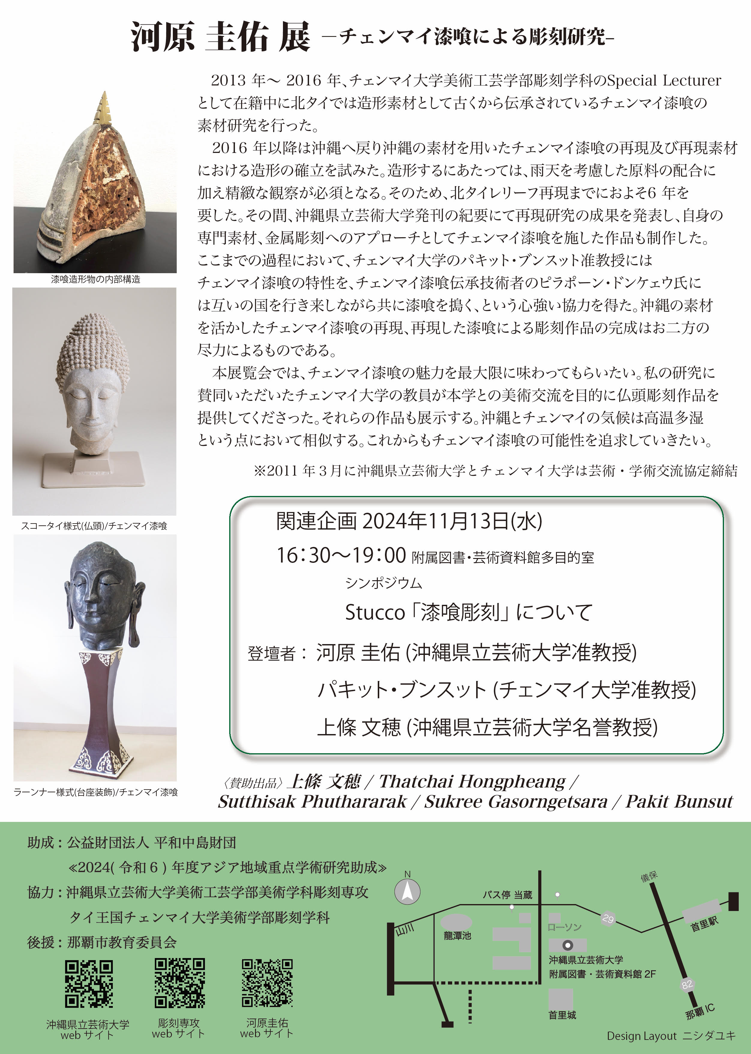 本学とチェンマイ大学は、これまでに国際交流展を通して多くの作家と交流を深めて参りました。また、芸術・学術交流協定を締結しており、本研究成果展では皆さまにたくさんの応援をいただき、沖縄の地で発表できることを、心より感謝しております。チェンマイ漆喰を用いたアジア造形の趣ある作品をご高覧いただきたく、ご案内申し上げます。