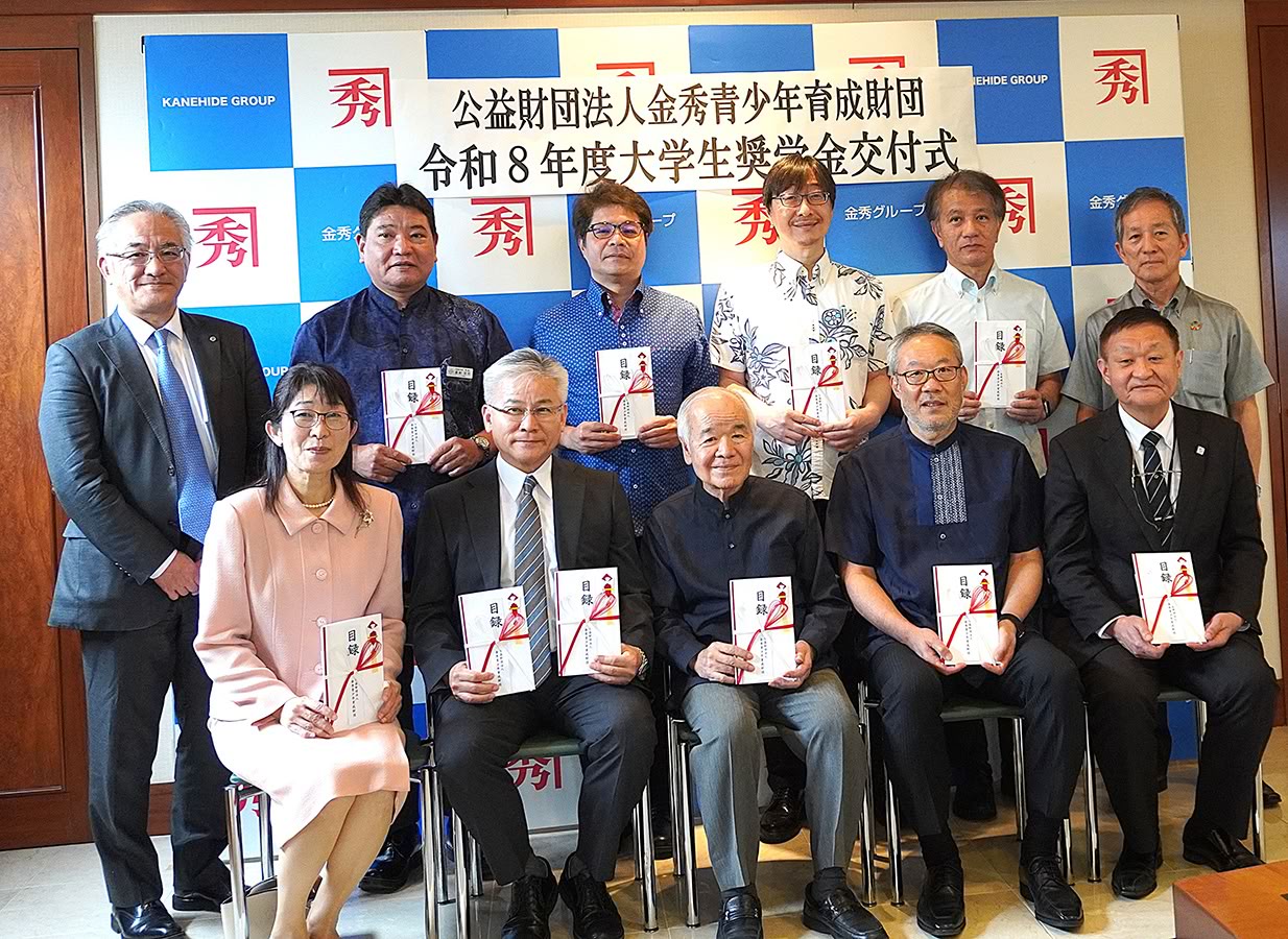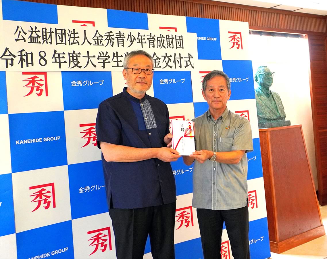 2026(令和8)年4月17日(金)に公益財団法人金秀青少年育成財団大学生奨学金給付式が開催され、金秀青少年育成財団新垣秀彦理事長から本学阿部雅人副学長へ奨学金が授与されました。